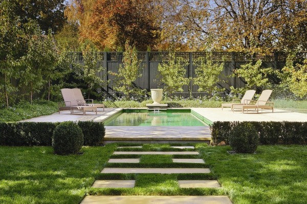 Khu vườn hiện đại này thiết kế những tảng đá bước song song trên thảm cỏ tươi tốt. Cuối con đường đá là một hồ bơi nhỏ nhưng xinh xắn.