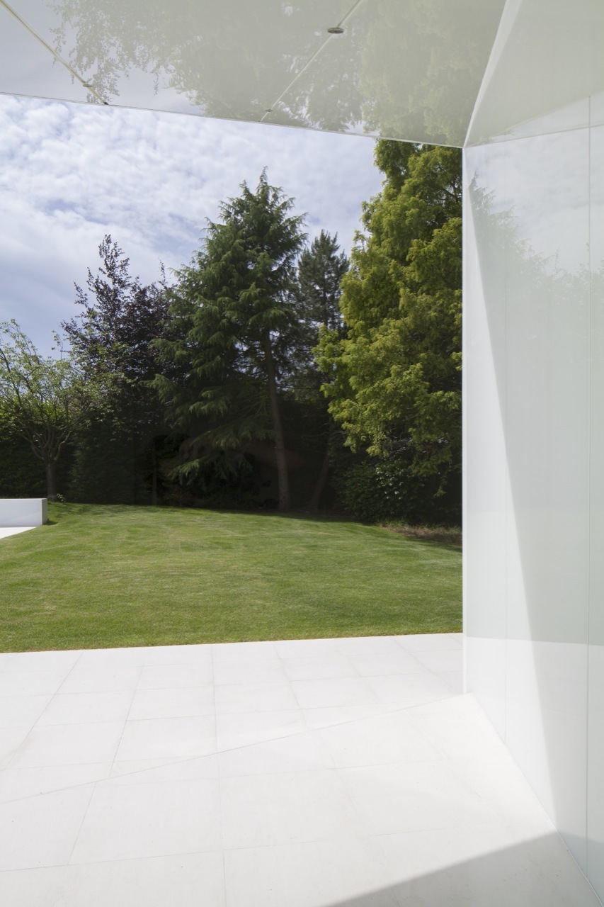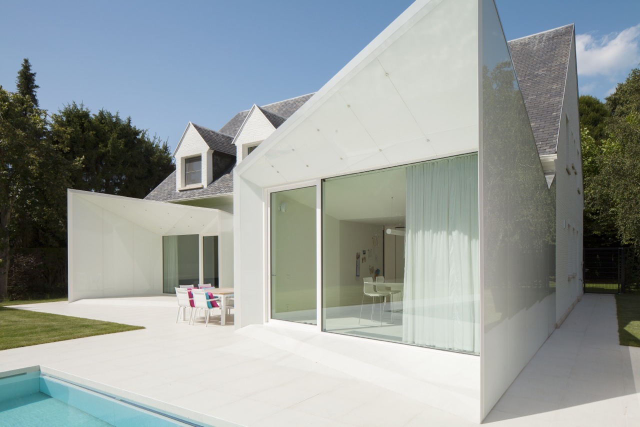 Kiến trúc sư giải thích: “Khách hàng đã đồng ý với thiết kế để có được giấy phép xây dựng đúng theo quy định xây dựng. Những quy định thật sự đã có tác động rất lớn đến thiết kế của biệt thự.” Bên ngoài của ngôi nhà được sơn toàn bộ màu trắng. Hồ bơi hiện tại đã được cải tạo đơn giản với hai khối lượng bổ sung được thêm vào nhằm tạo ra quá trình chuyển đổi liền mạch giữa nội thất và ngoại thất, kết nối ngôi nhà, hồ bơi và khoảng sân xanh tươi với nhau.