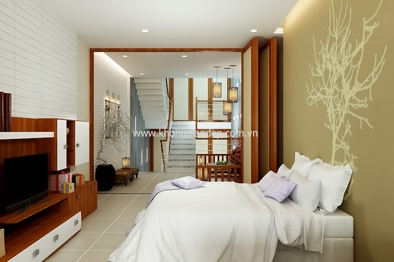 Bên cạnh đó, với thiết kế thông tầng từ trệt lên tới mái, ngôi nhà có thể tự do đón ánh nắng tự nhiên tràn ngập đến từng ngóc ngách. Thiết kế này cũng là cách kết nối các khoảng không gian khác nhau của ngôi nhà lại với nhau tạo thành một thể thống nhất và hòa hợp.