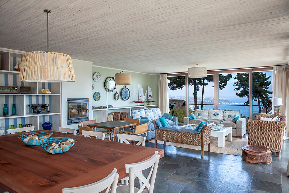 Ở tầng trên, ánh sáng mặt trời tràn ngập phòng khách rộng, nơi được trang trí bằng những đồ trang trí biển theo chủ đề và các yếu tố sang trọng khác. Một sàn ngoại thất dài được nối ra từ phòng khách pha trộn hài hòa với cảnh quan thiên nhiên, cho phép người sử dụng tha hồ sưởi ấm trong ánh mặt trời.