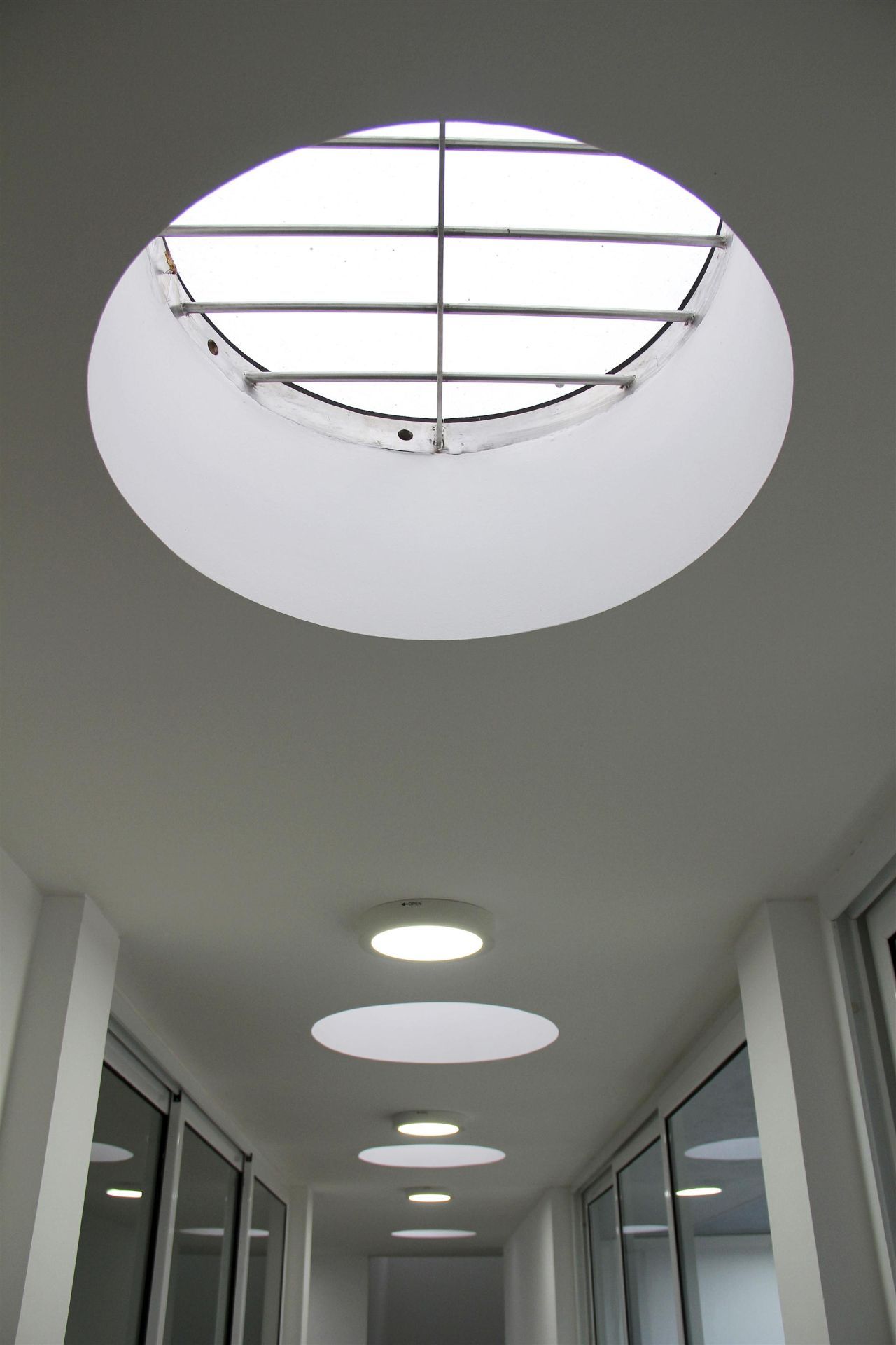 Ngôi nhà được trang trí rất ít với trần nhà hình vòm, sàn gỗ và hồ bơi bên trong dẫn lên phòng khách và phòng ăn. Trong sân vườn, gần cầu thang và tầng trên, cây dương xỉ, chuối và những cây trồng nhiệt đới khác được trồng xen kẽ với nhau, tạo cảnh quan xanh tươi cho ngôi nhà.