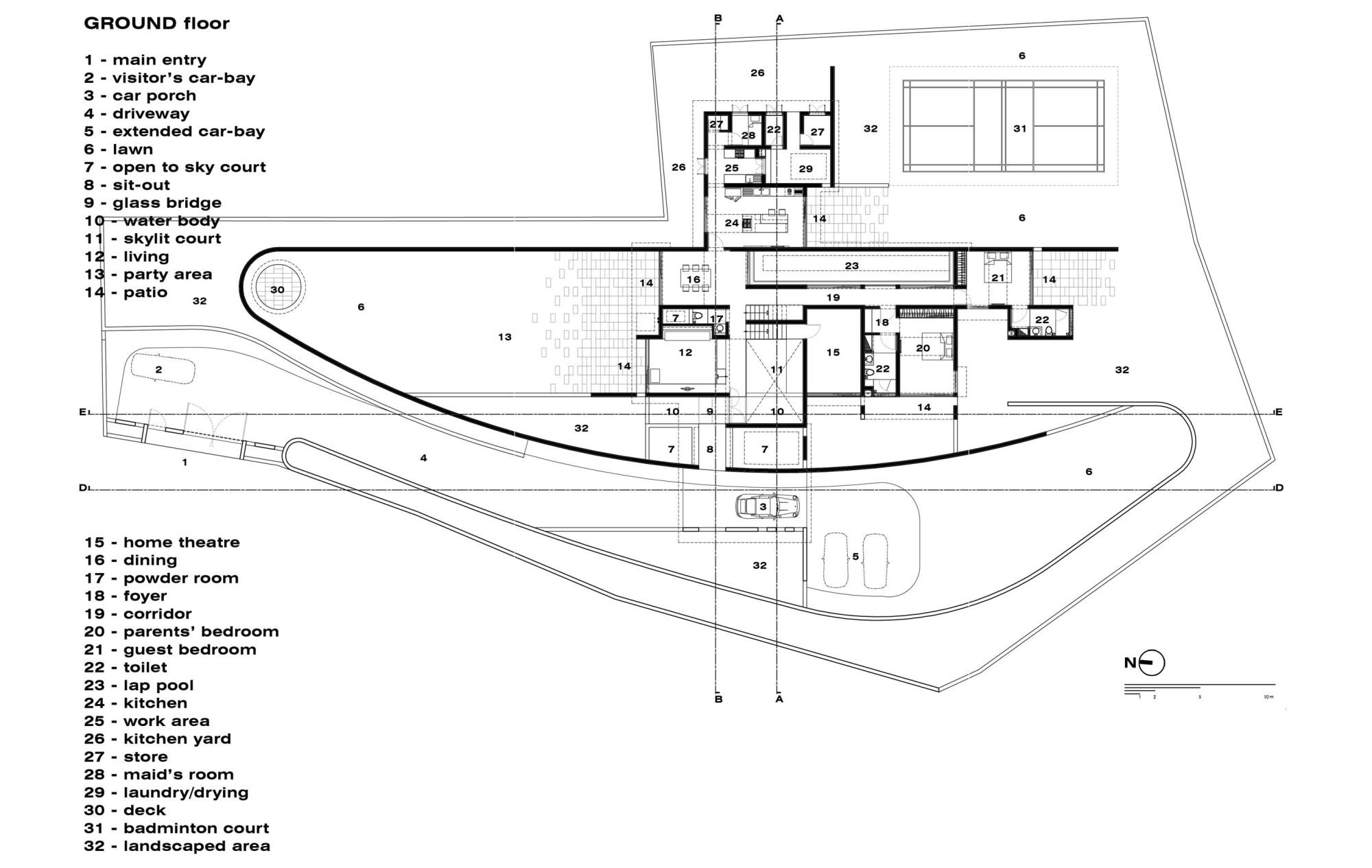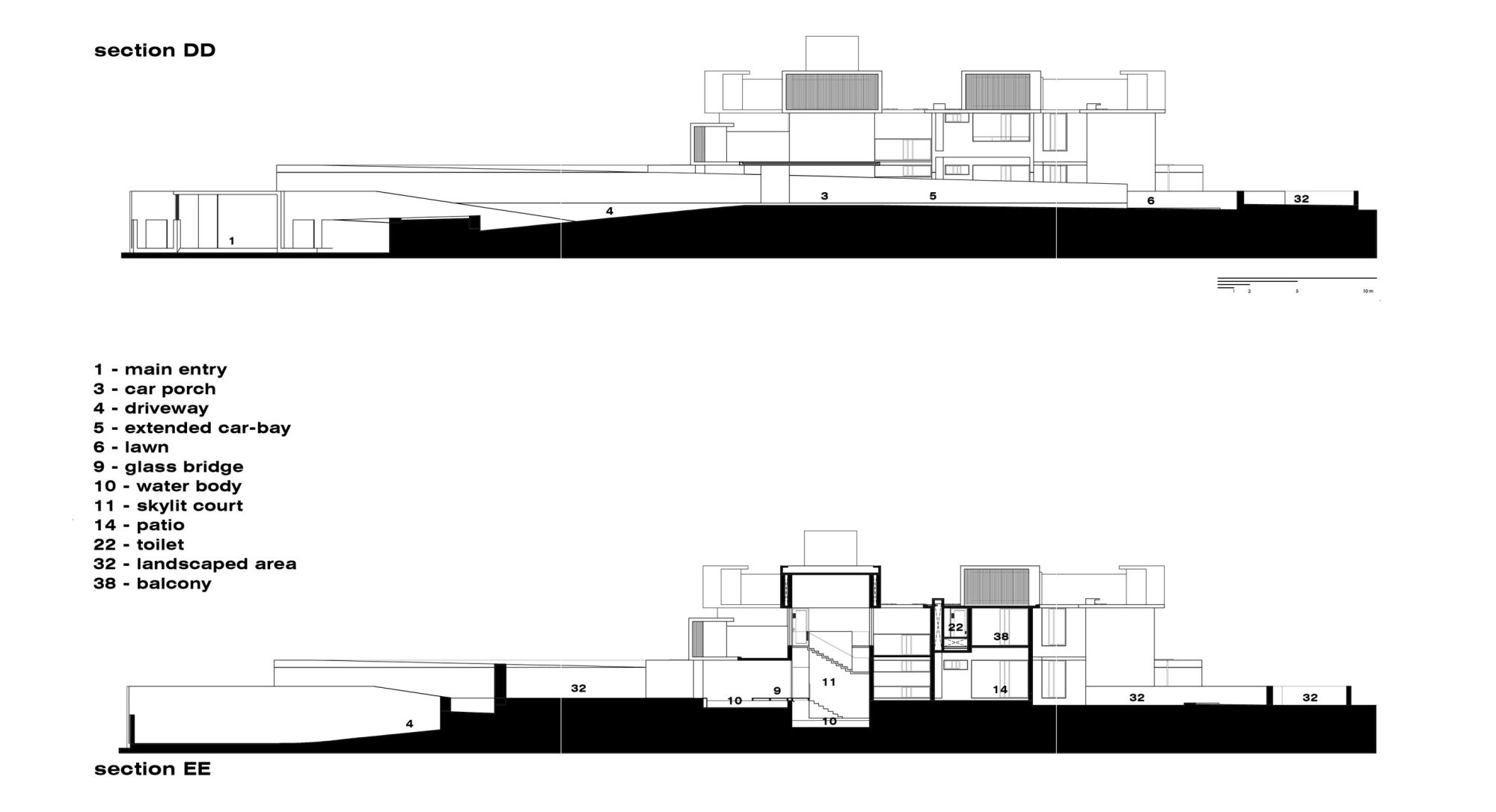 Các mối liên kết giữa các khu vực trong nhà và ngoài trời, những khoảng trống bên trong tường và các vật liệu kết hợp bổ sung giúp tạo vẻ đẹp bí ẩn cho ngôi nhà. Được thiết kế khéo léo, ngôi nhà để lại ấn tượng mạnh của sự lưu động. Phòng ăn và phòng khách mở ra cảnh quan tươi đẹp trong khi nhà bếp mở rộng ra cảnh sân vườn bên ngoài.