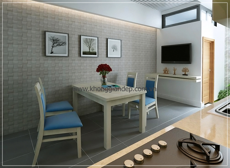 Căn bếp nhỏ nhưng được sắp xếp gọi gàng với đầy đủ nội thất: tủ bếp, bàn ăn. Chút xanh dương thanh lịch trên tông màu trắng nền nã chủ đạo của bộ bàn ăn cũng được điểm xuyết rất hợp lý.