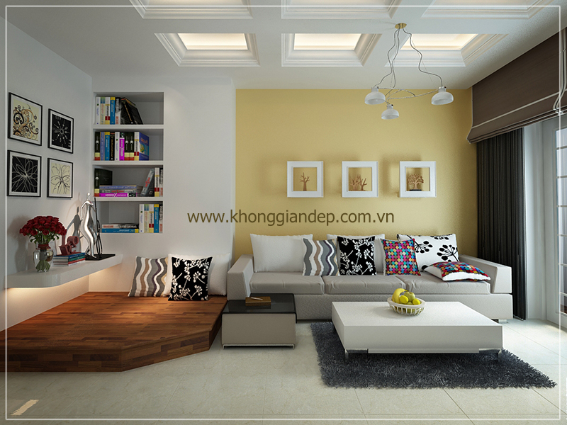 Phòng sinh hoạt chung được thiết kế nhẹ nhàng, kết hợp với một số nội thất mang màu sắc tươi vui và vật liệu gỗ tạo cảm giác ấm cúng trong những phút giây cả gia đình quây quần bên nhau.