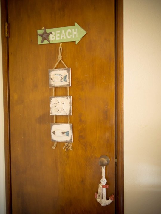 Ngay từ cửa ra vào, tấm bảng treo và những vật dụng trang trí hình mỏ neo đã báo hiệu bên trong căn phòng là không gian của biển.