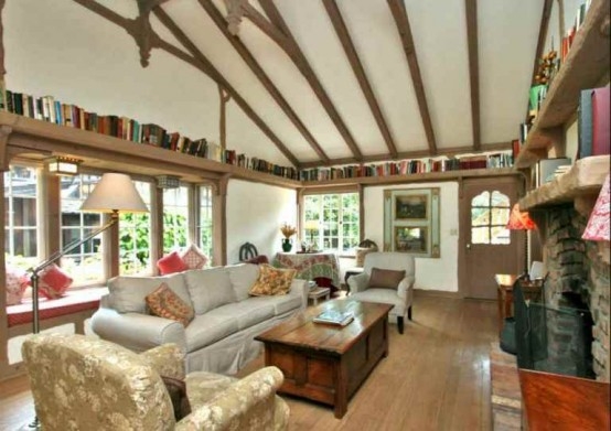 Trần nhà có dầm gỗ ở phía trên, kệ sách thiết kế đặt vòng quanh – đây là cách thú vị giúp bạn có thể sưu tập được nhiều cuốn sách hơn cho sở thích của mình.