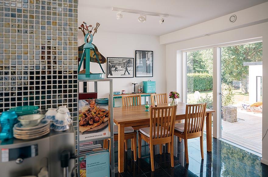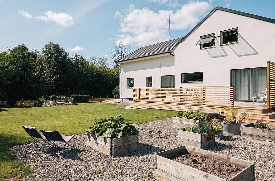 Ngôi nhà cũng có một khu vườn rộng rãi và đẹp mắt, cùng một hàng hiên bằng gỗ đầy mê hoặc, là nơi lý tưởng cho cả gia đình thư giãn. Bên cạnh đó, các cửa sổ lớn mở ra ngoài làm tăng cảm giác như đang sống giữa thiên nhiên.