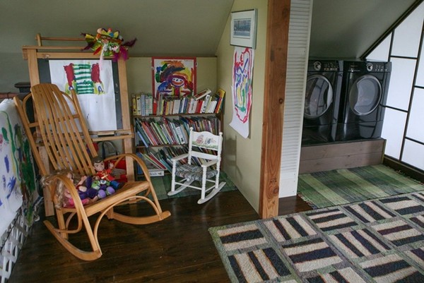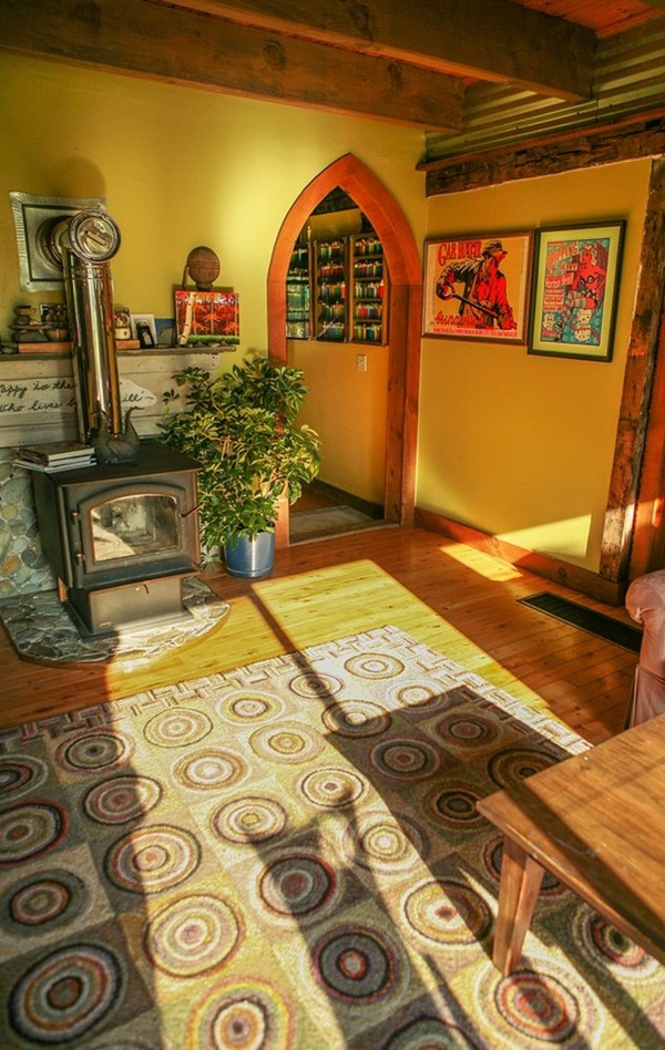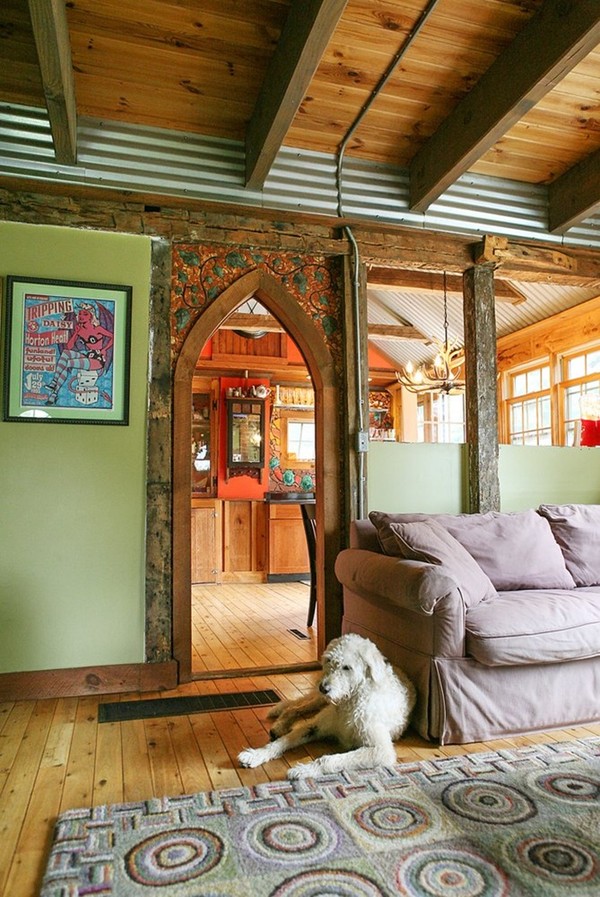 Không có chỉ có ngoại cảnh đẹp, bên trong nhà cũng rất tiện nghi và đẹp mắt với phong cách dân gian pha lẫn kiến trúc Gothic độc đáo và mời gọi. Phòng khách với những họa tiết bắt mắt theo phong cách dân gian. Ánh sáng từ cửa sổ và trần nhà chiếu xuống tăng thêm vẻ long lanh và chiều sâu cho căn nhà. Trên tường trang trí bằng những tấm áp phích hòa nhạc cổ điển.