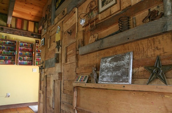 Tường nhà bằng gỗ thô mộc.