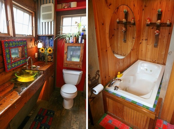 Tường nhà tắm được ốp gỗ ấm áp và cổ điển. Phần gỗ này được tận dụng từ những mảnh gỗ còn tốt khi sửa những phần khác của căn nhà. Riêng phòng tắm được lát bằng những hòn cuội mà hai vợ chồng mang về từ một chuyến đi biển.