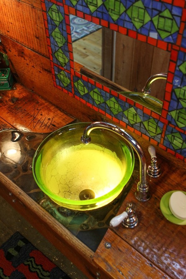 Bồn rửa màu xanh lá bằng thủy tinh được mua ở một cửa hàng chuyên đồ nội thất với giá rẻ.