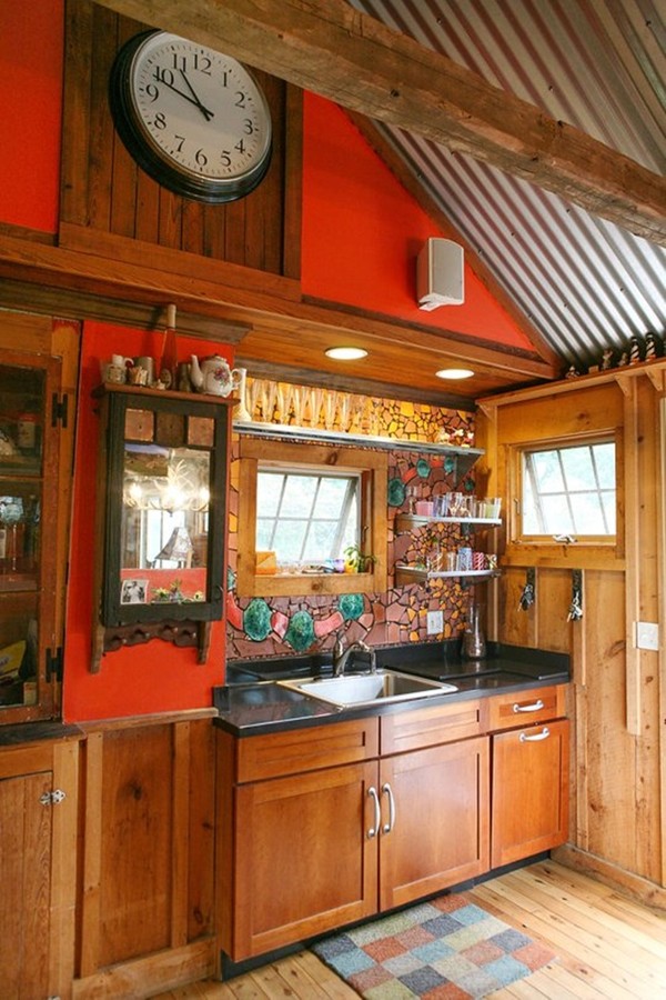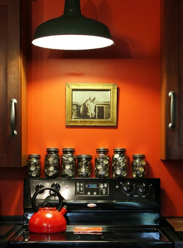 Tường bếp được sơn màu da cam và dưới tác động của ánh sáng, màu sơn tường sẽ có những biến chuyển thành màu đỏ. Thực tế là nội thất của căn bếp này khá hiện đại nhưng lại được ẩn giấu trong một thiết kế cổ điển với tủ gồm những họa tiết trang trí dân gian.