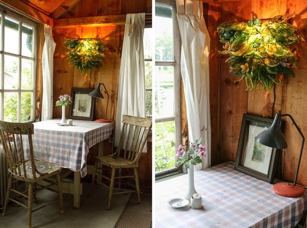 Bàn nước với cửa sổ nhìn ra vườn và đèn treo ấn tượng.