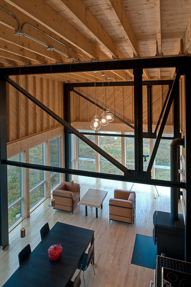 Việc xây dựng ngôi nhà không đòi hỏi sự đầu tư đáng kể. Kiến trúc sư giải thích rằng ngôi nhà được xây dựng với ngân sách cực kỳ thấp nhưng vẫn đáp ứng được khí hậu khắc nghiệt tại vùng đất: “Đây là một hình mẫu ngôi nhà được xây dựng với giá cả khiêm tốn và phải chăng. Một cấu trúc thượng tầng lớn bằng thép được mạ kẽm và neo vào vách đá. Cấu trúc chính bằng thép thể hiện trên nội thất. Ngôi nhà được dựng theo hình thức căn hộ đóng khung hình hộp đơn giản và được bao quanh là gỗ tuyết tùng“. Tầng một của ngôi nhà là một phòng khách mở và rộng rãi với cửa sổ trên ba mặt và tầng hai là một phòng ngủ với tầm nhìn toàn cảnh ra đại dương. Sự đơn giản trong kiến trúc ngôi nhà giúp tăng cảm giác yên bình, phù hợp với chốn nghỉ ngơi, xa lánh cuộc sống ồn ào.
