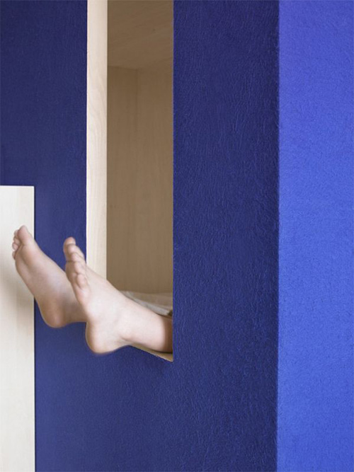 Phòng riêng của bố mẹ và các con chính là hai chiếc hộp gỗ làm bằng gỗ và phủ một lớp dạ màu xanh coban tươi sáng, được đặt chéo nhau.