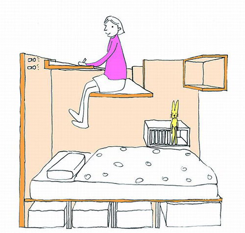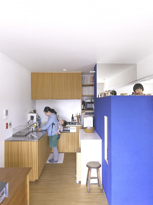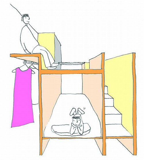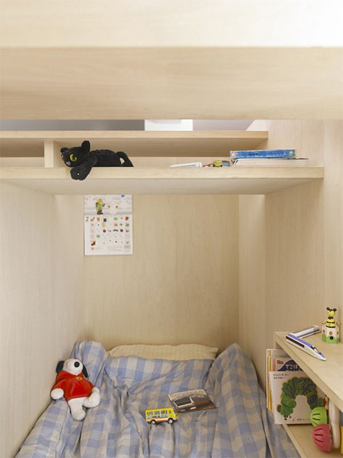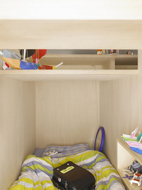 Chiếc hộp với lớp vỏ bọc màu xanh được sử dụng làm phòng ngủ của hai vợ chồng và đứa con nhỏ nhất. Chiếc hộp còn lại là một không gian riêng tư dành cho ba đứa con lớn hơn.