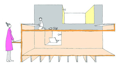 Ban đầu, căn hộ với diện tích khoảng 70m2 này được chia thành nhiều phòng khác nhau. Tuy nhiên, các kiến trúc sư nhận định việc giữ lại cấu trúc ban đầu sẽ rất khó tạo ra được một thiết kế nội thất tươi sáng và rộng rãi. Kết quả, tất cả các bức tường đã được xóa bỏ, biến toàn bộ căn hộ thành một căn phòng rộng lớn. Sau đó, hai cấu trúc hình hộp bằng gỗ đã được thêm vào, bố trí nằm trên một đường chéo. Không gian phía trên hai chiếc hộp chỉ cao 1.1 mét nhưng đủ chỗ để cho những đứa trẻ chơi đùa.