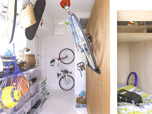 Hành lang bố trí hệ tủ gồm nhiều hộp nhỏ chứa đồ cho trẻ nhỏ. Xe đạp và các đồ dùng khác được treo lên nhằm giải phóng không gian sàn, giữ cho mọi thứ được gọn gàng.