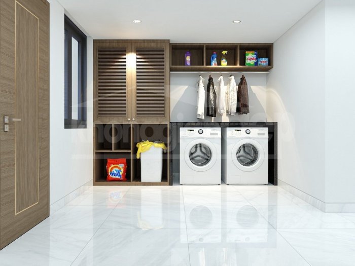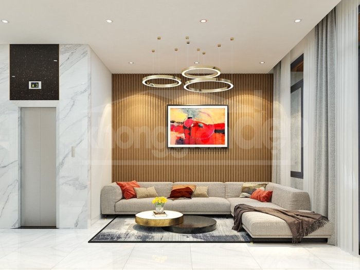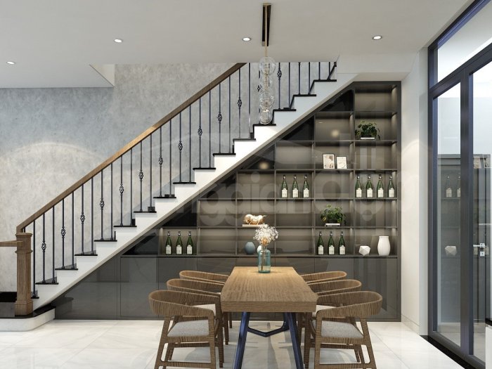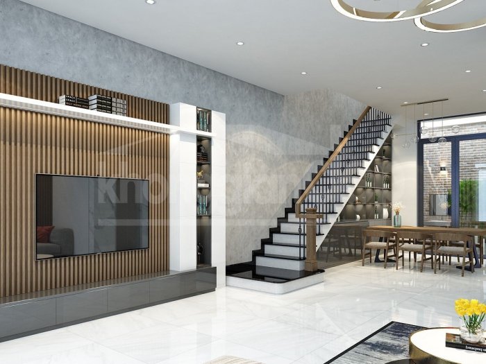 Nội thất căn nhà đều được thiết kế theo phong cách hiện đại, tối giản, nhằm tối đa hoá không gian sử dụng. Phòng khách nối tiếp phòng bếp/ăn tạo thành 1 không gian mở rộng lớn ở khu vực tầng trệt. Việc sử dụng gạch lót sàn màu trắng và đá hoa cương ốp tường còn khiến không gian nơi đây bừng sáng, mang lại cảm giác thoải mái dễ chịu.