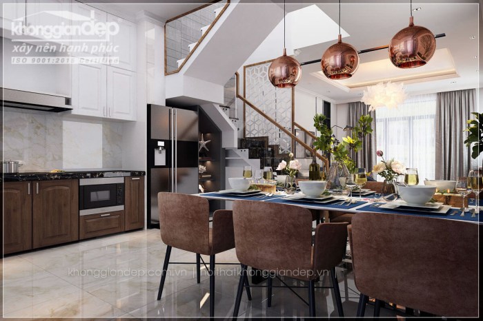 ✍Những đường nét mạnh mẽ và hình khối được sử dụng cho tầng trệt mang đến sự hiện đại, cùng với màu sắc trung tính, không gian tầng trệt trở nên ấm cúng và gần gũi. Cùng với đó, một vài nét cổ điển, những chi tiết điêu khắc mái vòm trên nội thất được thêm vào một cái tinh tế và hài hoà tạo nên nét độc đáo riêng cho căn nhà phố này.